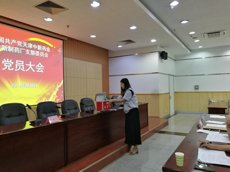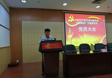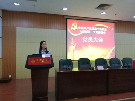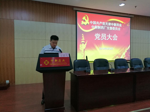2019年8月8日上午,中新制药厂在中新产业园101报告厅隆重举行中共天津中新药业中新制药厂支部委员会换届选举大会,大会由中新制药厂副厂长王岩主持。经民主投票,选举产生中共天津中新药业中新制药厂支部委员会委员。具体名单如下(按照姓氏笔画排列):王岩、朱宏科、庞纪平、柴萌、游强蓁。